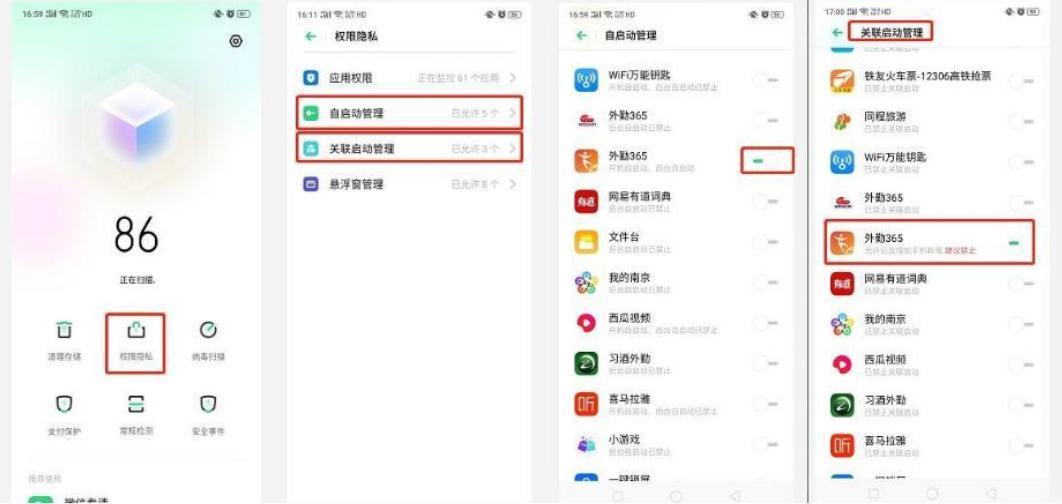 1、开启手机管家中的权限隐私,打开自启动管理中的外勤365和关联启动中的外勤365。