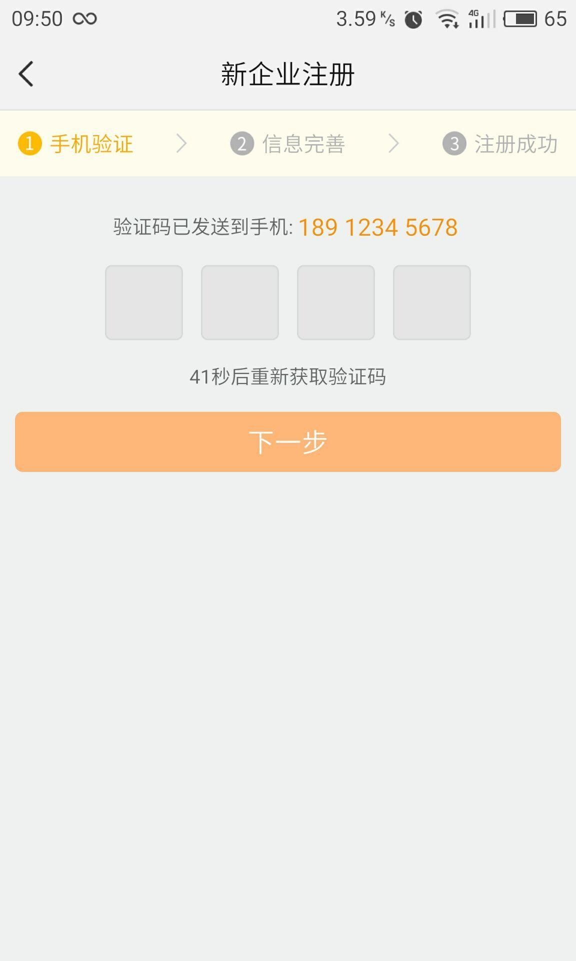 3.输入获取到的验证码,继续点击“下一步”,到企业注册页面。