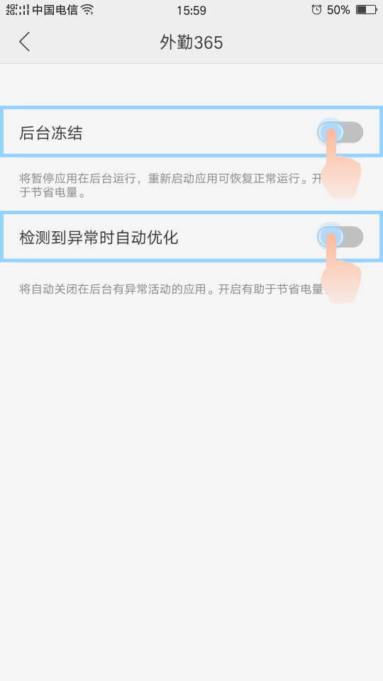 5.手机设置-电池—在其他中找到外勤365—将后台冻结和检查异常自动优化都关闭;