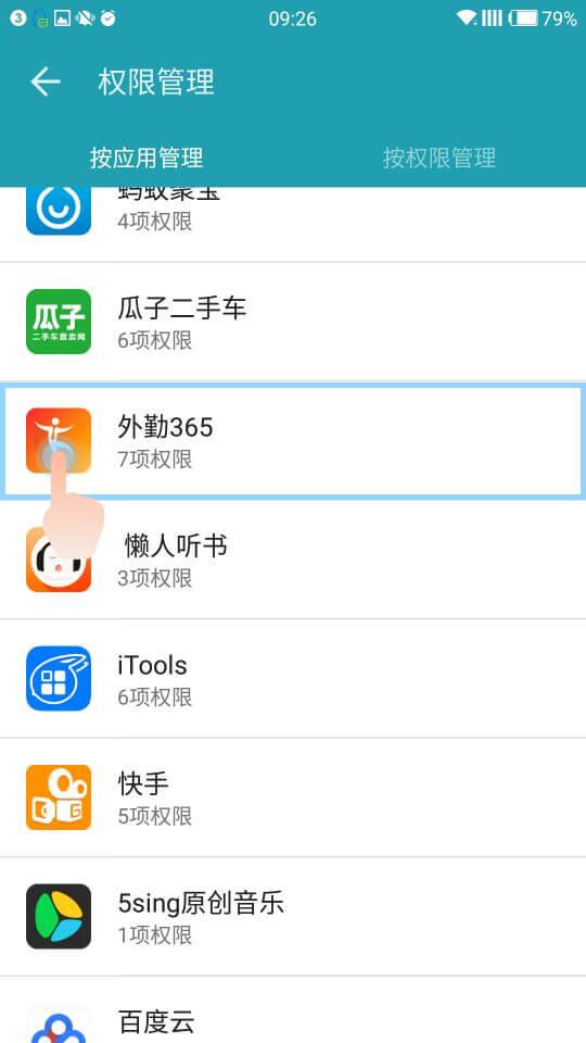 3.点击权限—应用权限管理,进去找到外勤365,将“相机”和“定位”选择允许;