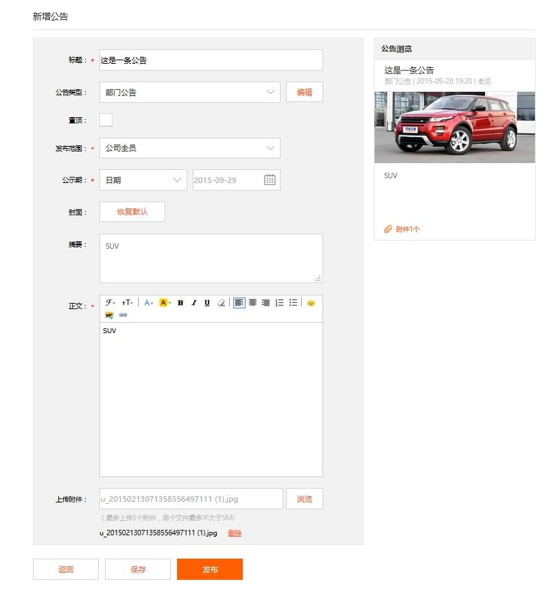 领导在外勤365电脑端后台页面发布各种类型新闻公告,可以指定发布范围,内容支持文字、附件。