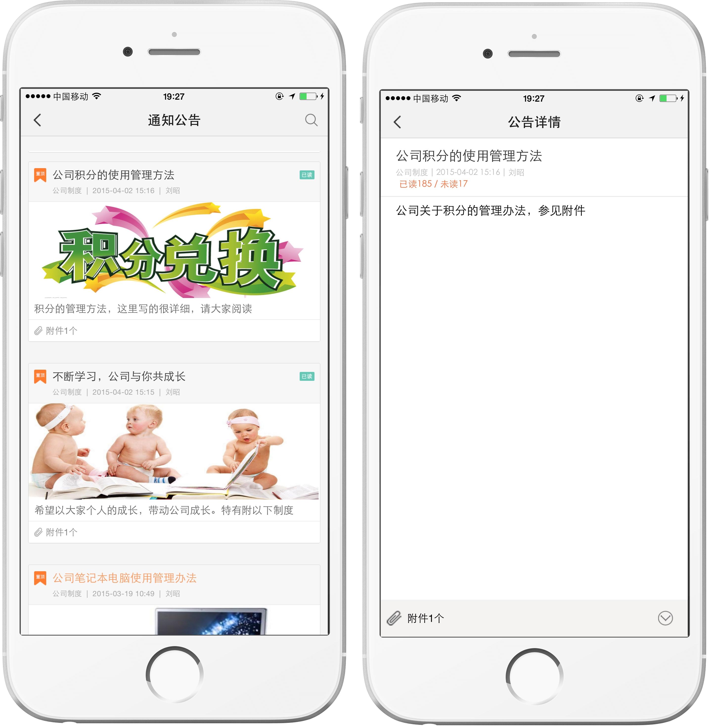 在外的业务员通过外勤365手机端,点击“通知公告”功能即可看到公司各部门发布的新闻通知详情。