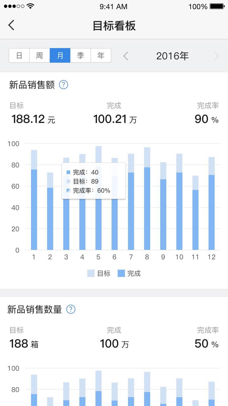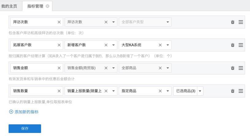 指标支持拜访客户数、拜访次数,新增客户数的行为指标,也支持销售数量、销售金额等业绩指标,更多指标陆续完善中。