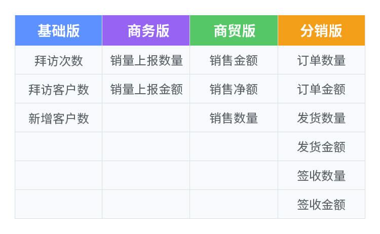 拜访次数+拜访客户数+新增客户数+销售金额/数量