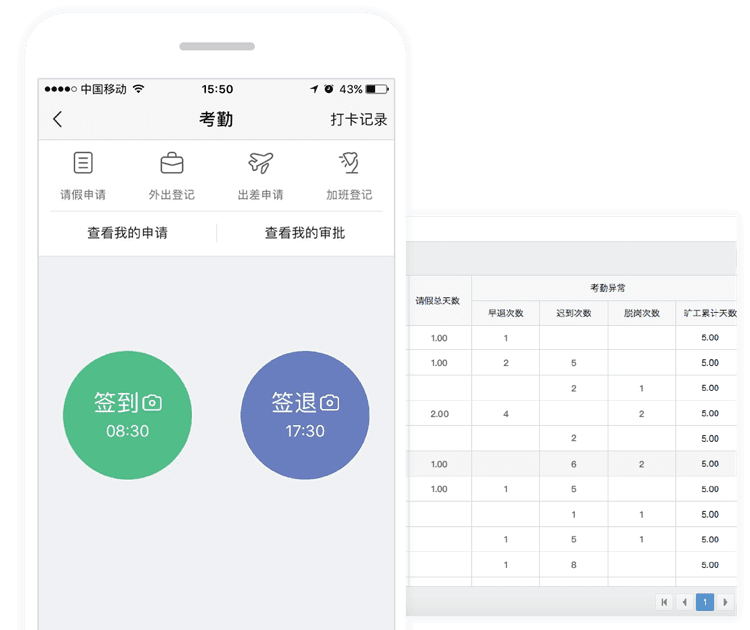 灵活设置考勤点,手机打卡更方便,后台自动生成多维度的考勤分析报表,辅助管理者计算员工薪酬。还支持请假、外出、加班、出差的申请和审批,每个审批流程都可以根据需要自定义设置。