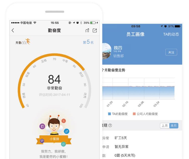 基于平台中记录的员工行为海量数据,运用大数据模型从“时间管理、沟通汇报、敬业度、辛苦度、客情维护”五个维度自动计算出每一个员工的勤奋度;并为员工全面画像,管理者可以更透彻地了解每一个员工的日常表现和工作业绩,让优秀者脱颖而出,让懒惰者无处藏身。
