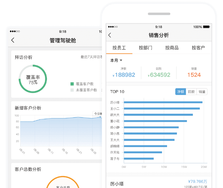 管理驾驶舱可以从多个维度呈现员工行为和业绩统计数据,聚合了考勤、日报、客户、拜访、销售业绩等多个业务的分析报表,管理者可以很方便的在手机上实时监控客户分布量、新开客户进展、客户拜访覆盖率、拜访完成率等指标,做到运筹帷幄。