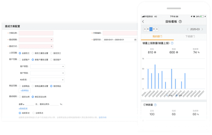 可按人、按部门制定销量目标,实时跟进销量完成进度,随时调整销售策略应对市场变化。 可多维度配置销量提成规则,实时计算提成,为薪资发放提供支撑。