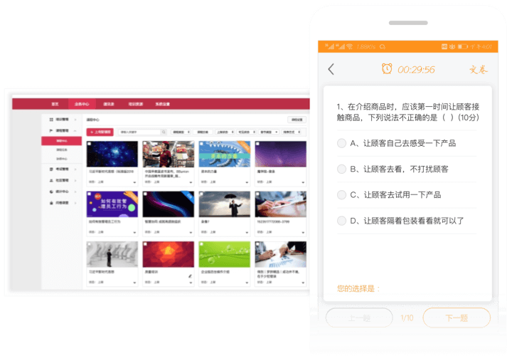 市场方案一键通知,信息实时同步。 视频课程远程培训,在线考试保证培训效果。 培训资料永久保存,新员工入职自助学习。 支持快速查询、对外分享,扩大品牌传播。