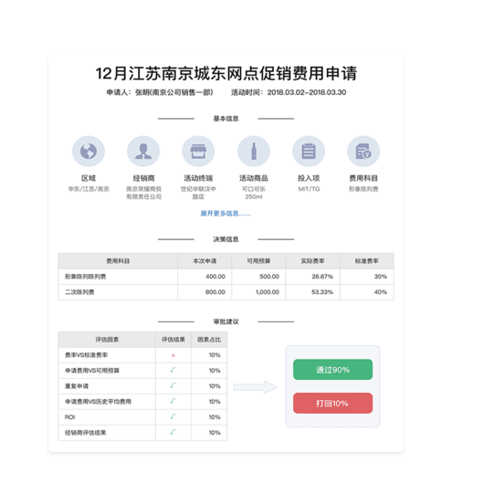 依据费用金额、销量、历史活动效果等数据,对每一次费用申请单做全面的数据画像,并给出智能审批建议,以此辅助管理者进行审批决策,将高效智能渗透到每一个工作环节。