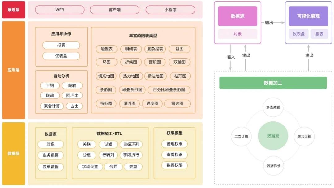 数据流引擎:多源整合,智能加工 报表工厂:零代码配置,业务自助分析 权限安全:多重管控,合规无忧
