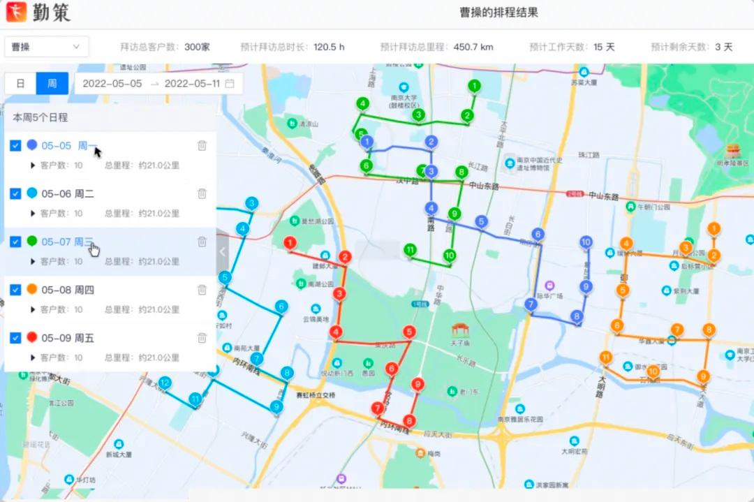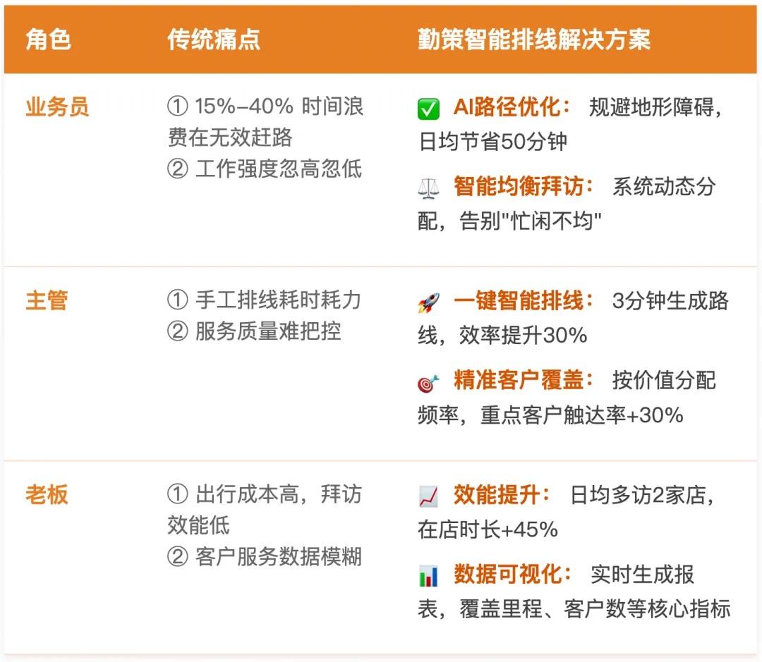 ❷ 拜访频率 “一刀切”:重点客户服务不足,80% 精力耗在低价值门店,增长机会悄悄流失; ❸ 工作量像坐过山车:今天跑断腿、明天闲到慌,团队效率大打折扣。 这些隐性损耗如慢性毒药,正偷走业务员的服务时间 —— 而勤策智能排线,正是破解困局的关键。 02 勤策智能排线 用“AI + 业务逻辑”为你打开效率新大门! ❶ 效率革命:告别“在途奔波”,每天多出一小时服务客户! AI 算法秒级运算: 只需输入客户地址、拜访频次、服务时长、路线起始等策略,AI 算法就能在眨眼间生成规避各种地形障碍的 “现实派路线”!告别手工规划的低效,效率提升30%,而且 100% 贴合真实路况! 交通工具专属适配: 无论是电动车的灵活、汽车的便捷,还是步行的精细,系统都能根据不同的交通方式,精确计算路段耗时(精确到 5 分钟)!彻底解决“导航 1 小时,实际 1.5 小时”的尴尬,让业务员的准时到店率飙升 90%! ❷ 质量升级:让“客户价值”成为路线规划的“导向标”! 自动分配黄金时间: 系统强制保障 Top20% 的高价值客户 获得 30% 的服务时长,并智能标注重点门店,彻底杜绝业务员的“选择性遗忘”,让每一次服务都精准触达核心客户! 动态平衡工作量: 通过直观的 周视图 / 日视图双模式,主管可以灵活拖拽调整门店拜访顺序,确保每天的拜访客户数量均衡,在途时间合理控制,彻底告别业务员“一天累瘫,一天闲晃”的极端情况! ❸ 数据闭环:排线越智能,客户画像越清晰! 反向优化客户管理: 在排线过程中,系统会自动检测 “未绑定位置”、“未分配负责人” 等 “隐形盲区”,及时提醒主管完善客户信息,让那些被遗忘的“沉睡客户”重新进入你的视野! 双向进化,数据驱动的持续优化: 勤策智能排线与客户管理系统深度融合,形成一个强大的智能闭环:客户信息的完善(如门店位置、服务需求等)直接提升排线的精准度;排线系统的使用越多,对客户的理解就越深入,更能优化客户服务时长和频次。 这种 “数据驱动” 的良性循环,让你的客户管理和业务效率实现真正的 “双向奔赴”! 智能排线带来的团队收益对照表